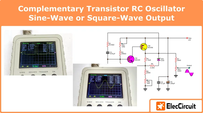 Complementary Transistor RC Oscillator – Sine-Wave or Square-Wave Output